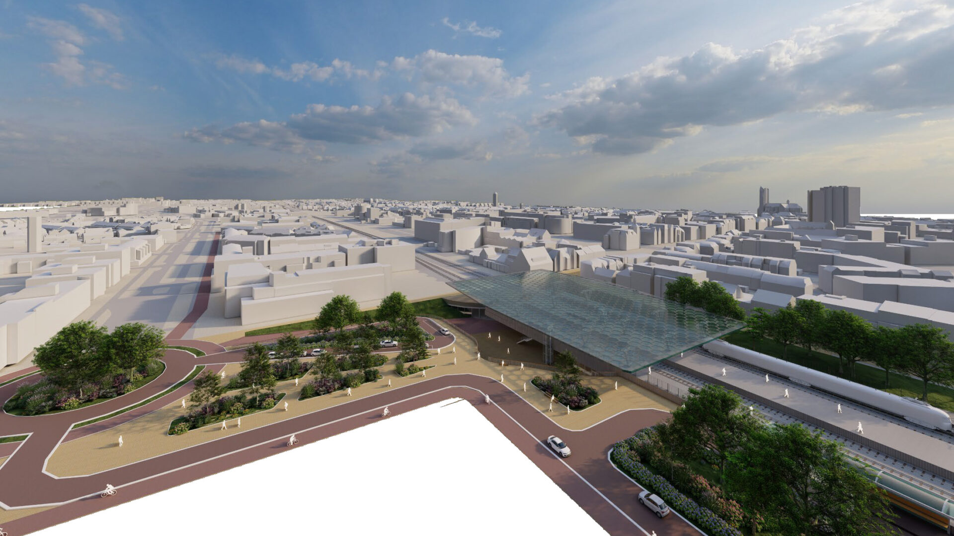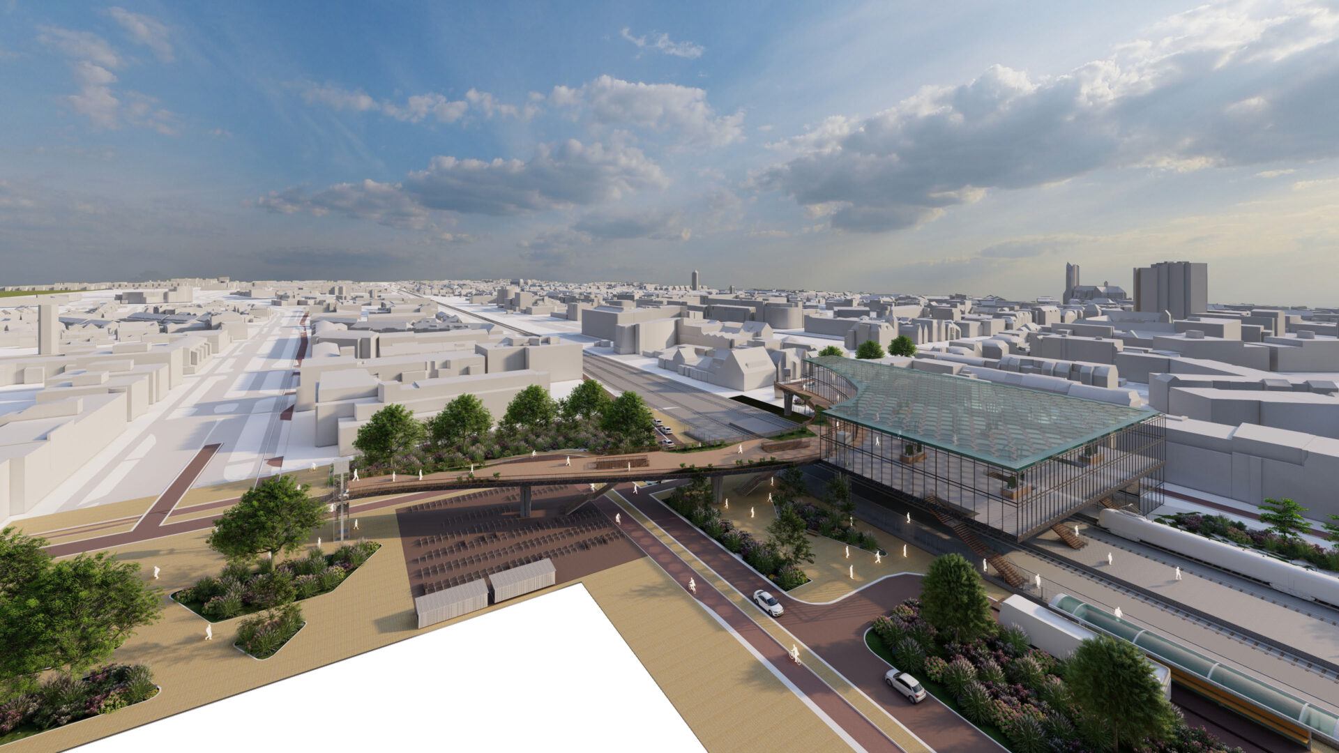De twee mogelijke varianten van het nieuwe station van Oss. De eerste impressie is van de variant met onderdoorgang. De tweede impressie en tekening zijn van de variant met verhoogde traverse | Haskoning