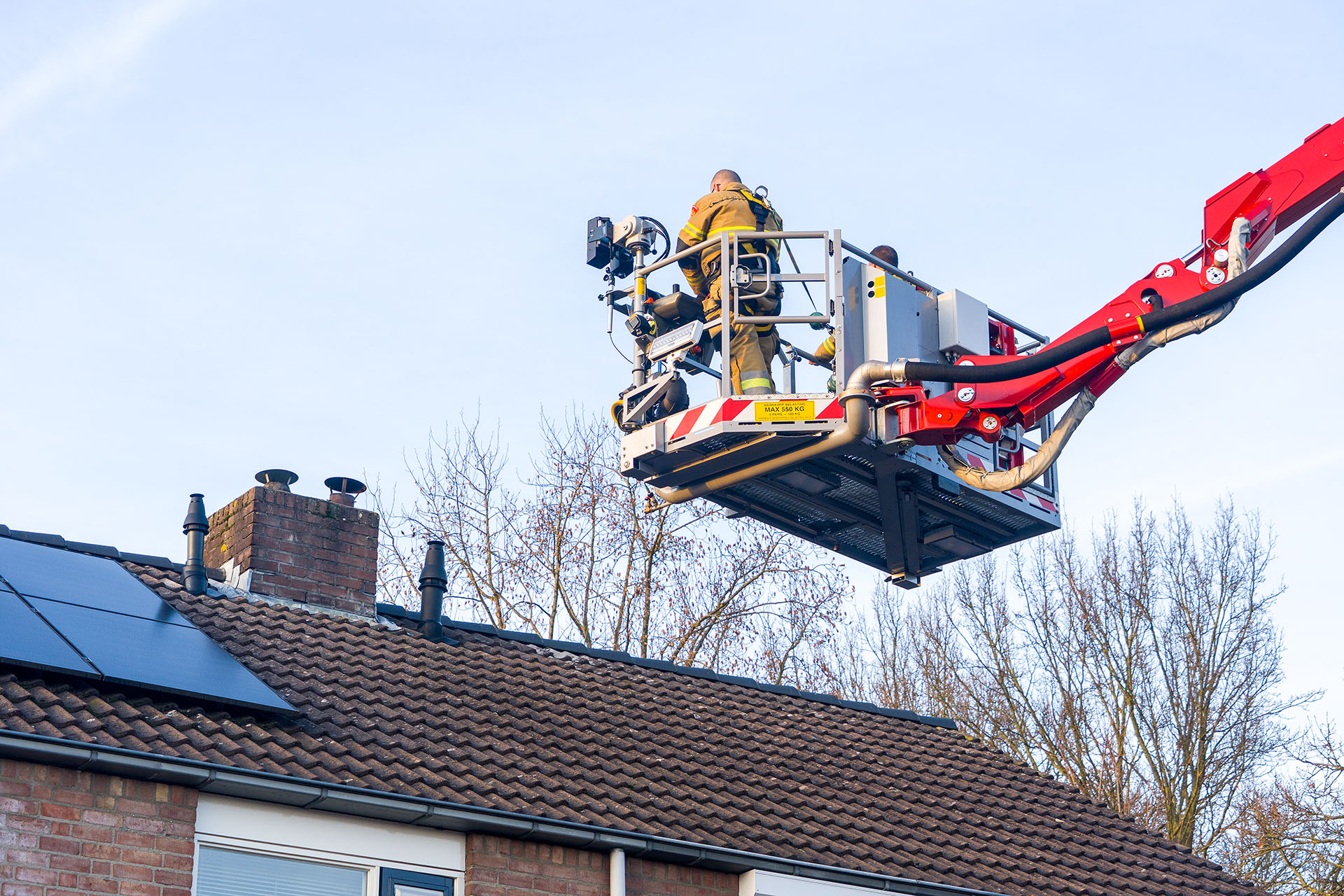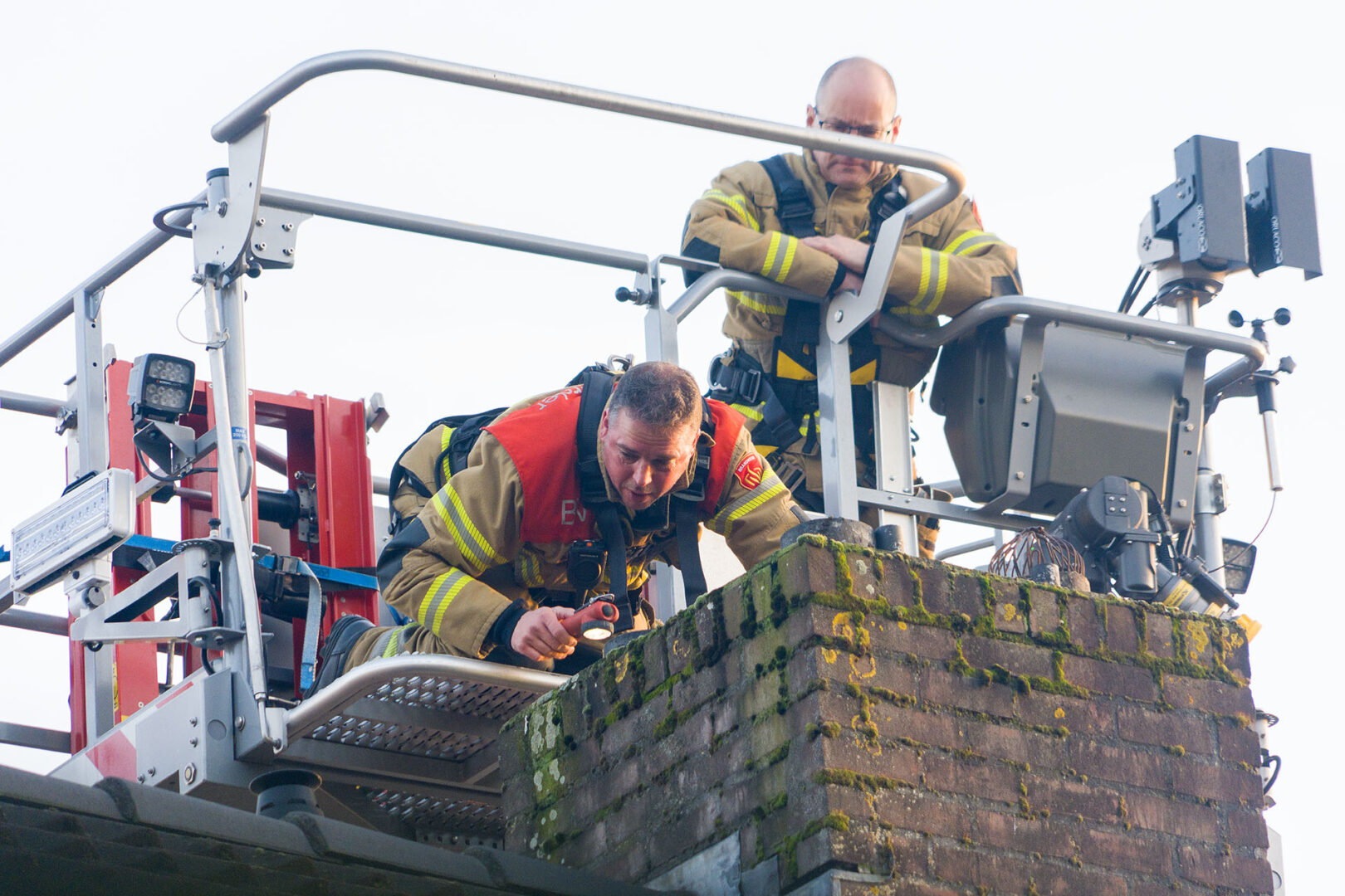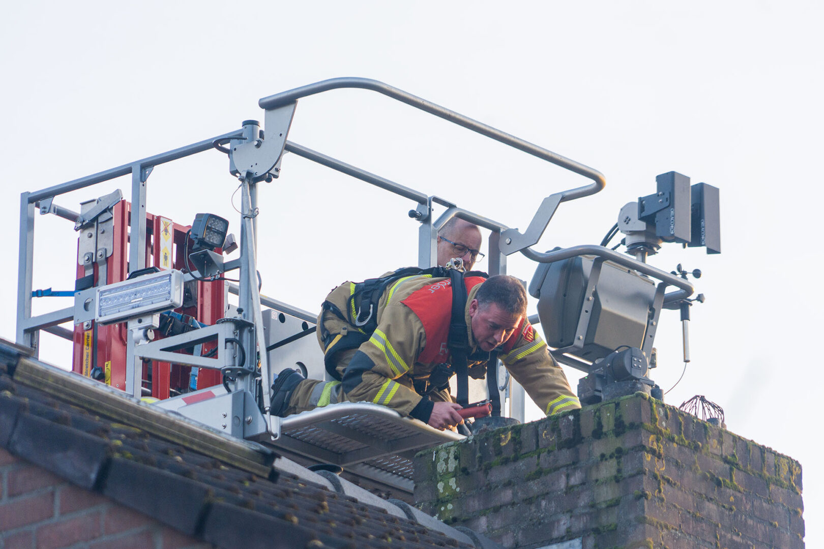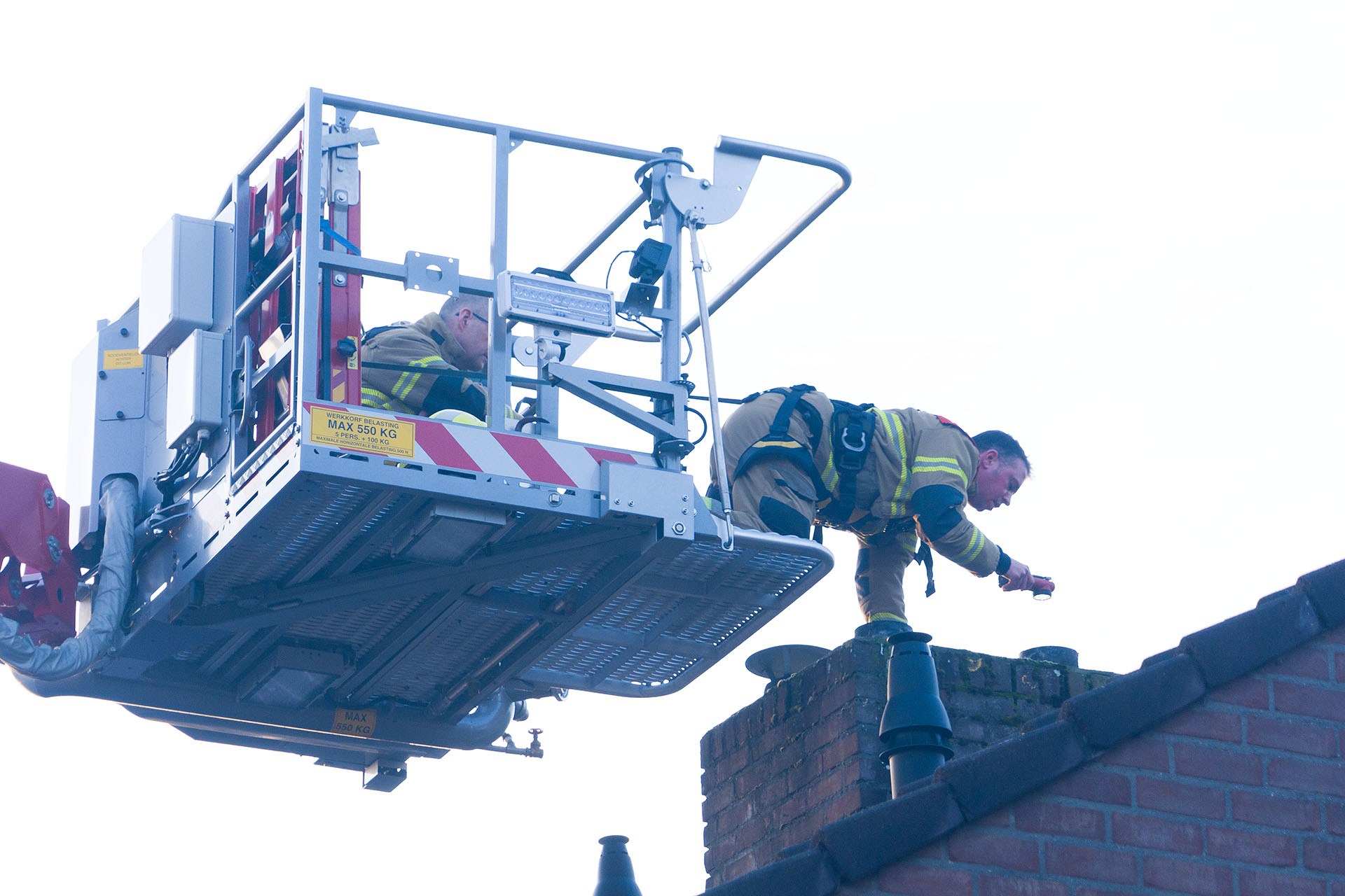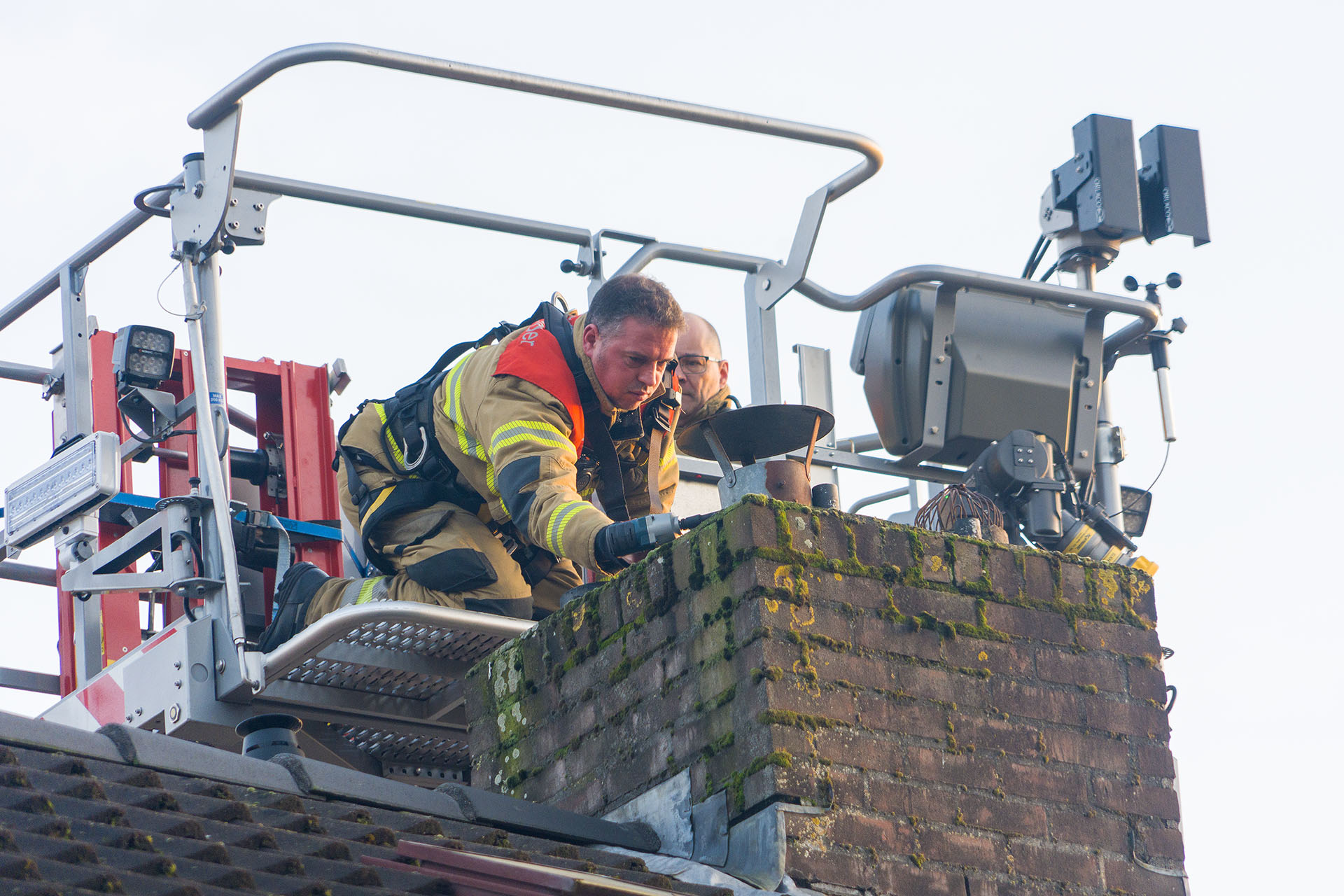Die rukte rond 16.00 uur uit met een hoogwerker. Een brandweerman demonteerde vanuit de korf meerdere afdekkappen van schoorsteenpijpen maar zag geen vogel. Wel was een bocht te zien.