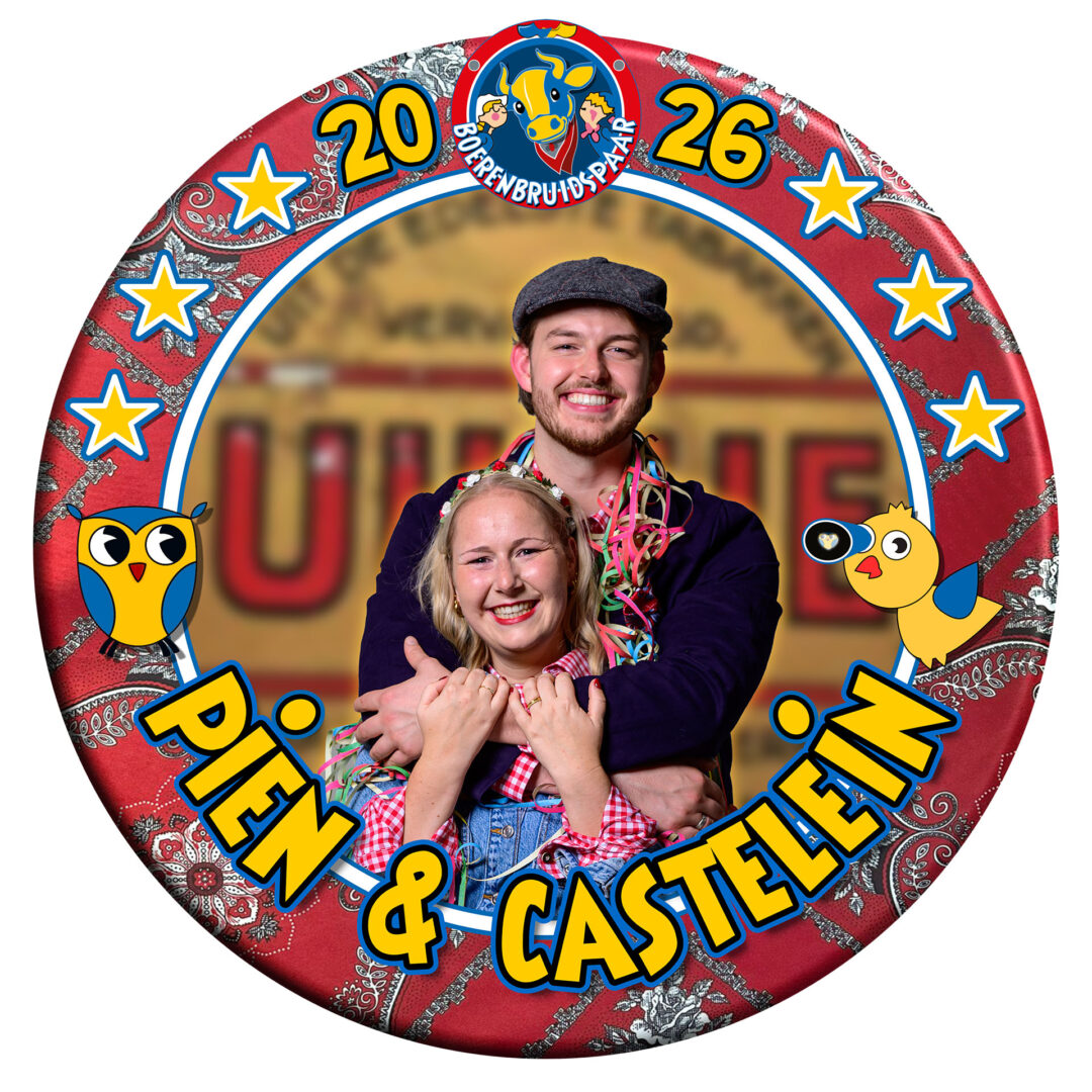 Carnaval? Da’s bij Pien en Castelein me d’n paplepel ingegoten! Beide hebben ze vol trots in ut gevolg van d’n Stadsprins gestaan. En geloof ‘t of niet.. Hun verhaal begon al voordat ze de eerste polonaise konden lopen. De wiegjes stonden praktisch naast elkaar, met een heg er tussen. Castelein gluurde als menneke al door ‘t gat in de heg naar Pien, smoorverliefd. De jaren vlogen voorbij en telkens weer miste Castelein z’n kans… Tot hij op n dag weer door zijn verrekijker tuurde, en daar stond ze dan: Pien, met d’n zelfde lach als vruuger. Toen wist-ie: nou is ‘t menens…