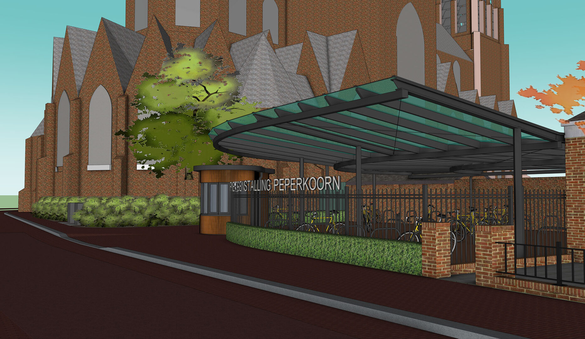 Aan de kop van de Peperstraat, op de plek tussen de Grote Kerk en het parochiehuis waar nu een klein parkeerterrein is te vinden, moet dit voorjaar een bewaakte en overdekte fietsenstalling voor 100 fietsen verrijzen. Die moet op verzoek van onder meer de SP ook een openbaar toilet krijgen. Het is de eerste van in totaal drie nieuwe stallingen in het Osse centrum die in de grote mobiliteitsplannen die wethouder Sidney van den Bergh in maart 2025 presenteerde waren opgenomen.